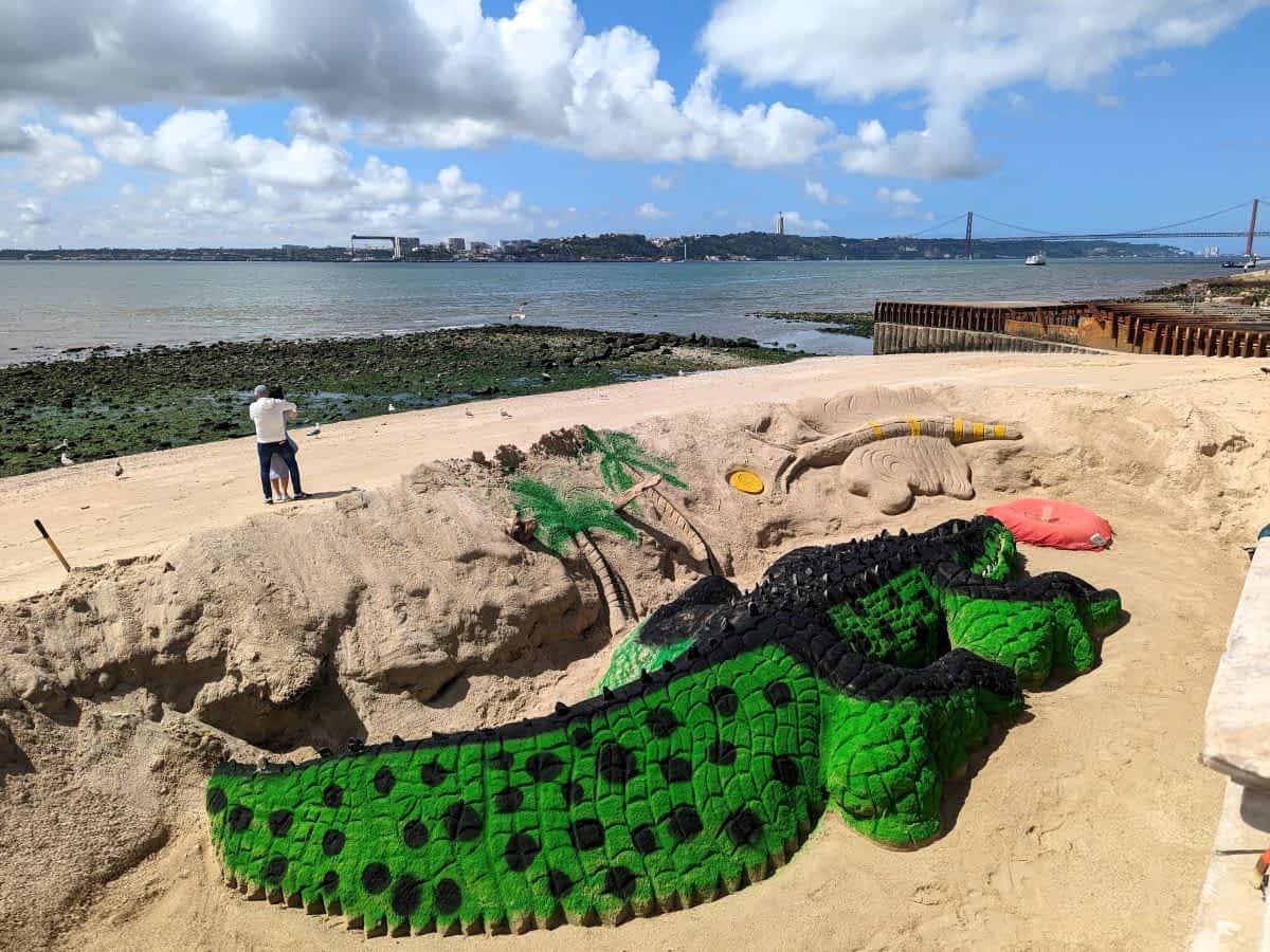 Unsere Sightseeingtour starteten wir direkt am Ufer des Tejo, wo wir einen ersten Blick auf die berühmte Brücke des 25.April und die Christusfigur "Cristo Rei" erhaschten. Sandkünstler am Tejo-Ufer Am Ufer beleben Künstler die Promenade und gleich daneben legen riesige Kreuzfahrtschiffe an. Ein kurzer Blick ins Hauptterminal lohnt sich: Wir waren beeindruckt, wie hell und modern die große Halle für die Passagiere ist.