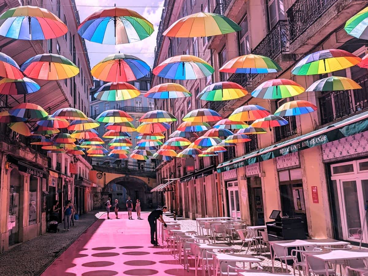 Auf unserer Entdeckungstour in der Nähe des Hafens (Cais do Sodré) stießen wir auf eine Straße, die einen starken Kontrast zu den traditionellen Gassen bildete: die berühmte Pink Street (offiziell Rua Nova do Carvalho) . Diese Gasse, die einst das Herz des Rotlichtviertels war, wurde durch das knallige Pink des Asphalts und die schwebenden bunten Regenschirme in eine hippe Fußgängerzone mit Cafés und Restaurants verwandelt.